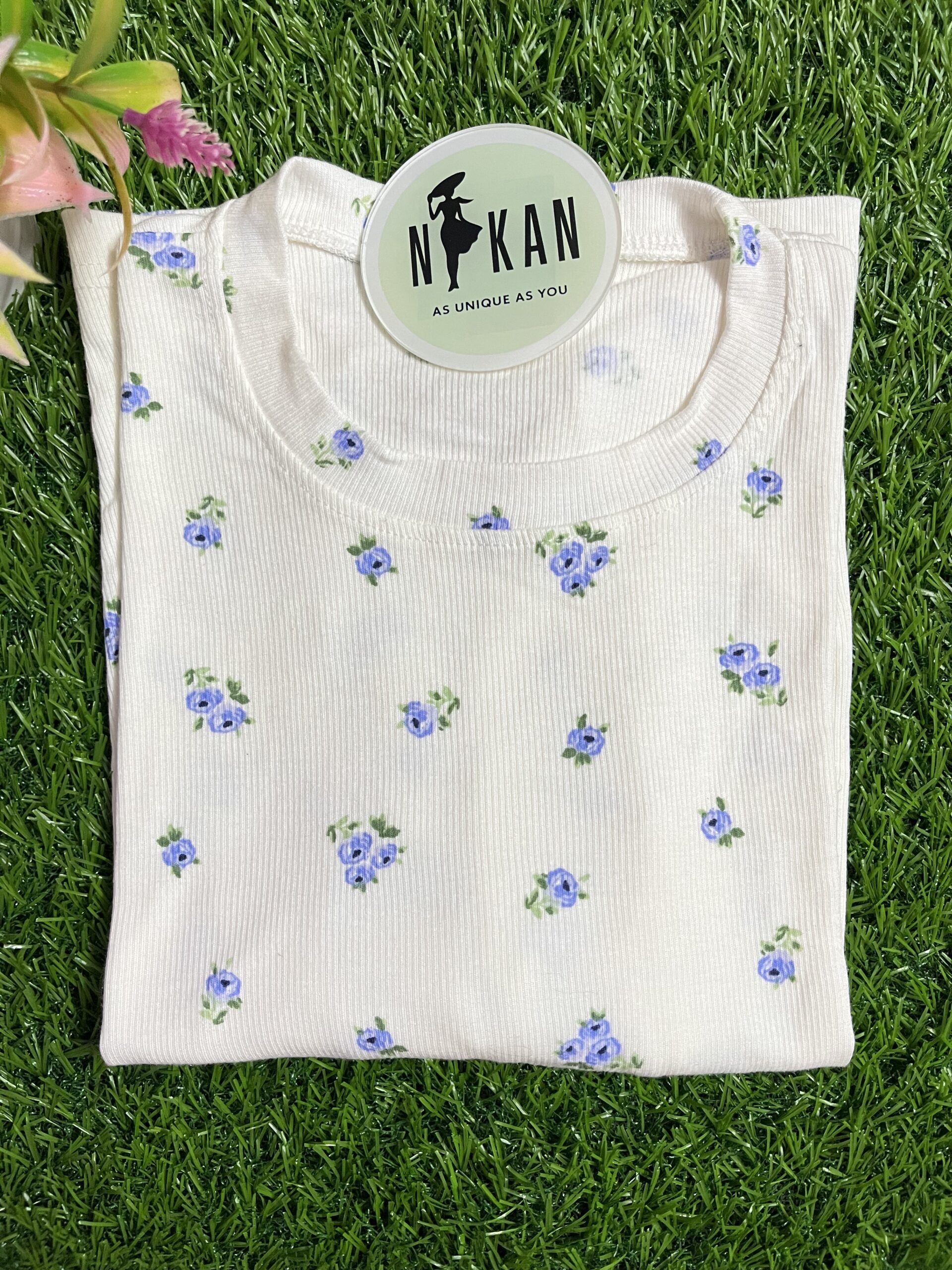Blue blossom – your go-to white crop t shirt with delicate mini blue flowers. Crafted from a premium rib cotton knit fabric which stretches naturally and gives a comfortable body hugging fit.